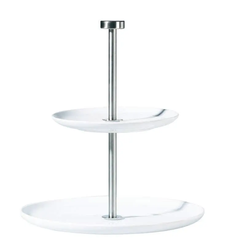 Die dekorative und zeitlose Etagere macht nicht nur optisch etwas her, sondern ist auch ausgesprochen praktisch. Auf zwei Etagen lassen sich Aufschnitt und Obst zum Frühstück, Kuchen & Gebäck am Nachmittag oder Antipasti & Co am Abend servieren. Die Etagere hat einen Griff aus Edelstahl (Höhe: 25 cm) und zwei verschieden große Teller aus hochwertiger Keramik.