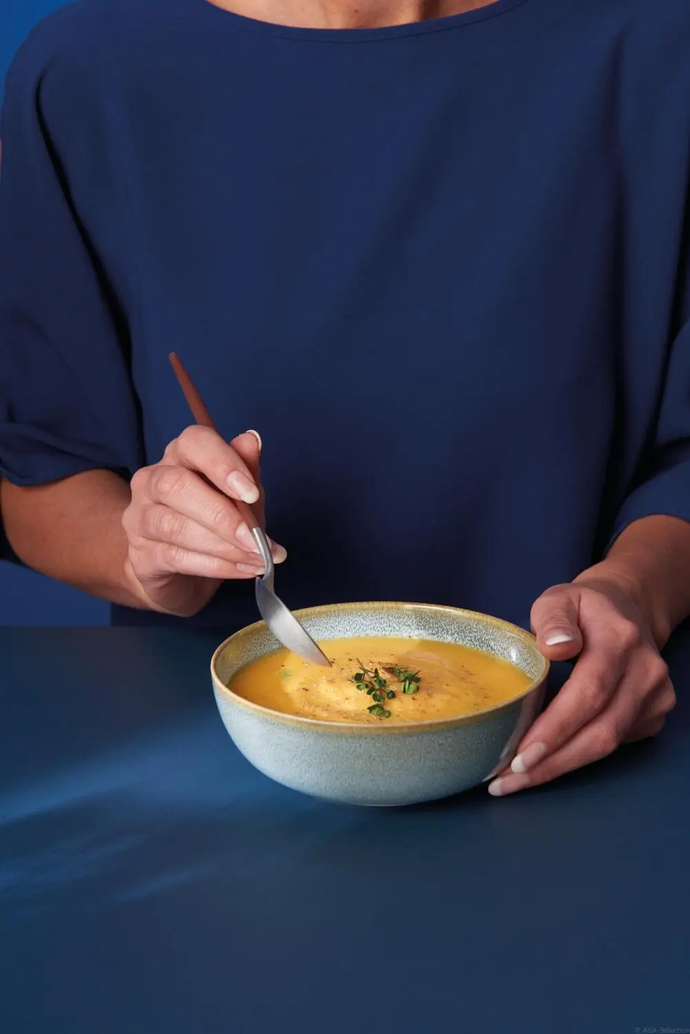 ASA Pasta-/ Suppenteller Saison denim, 21 cm. Tiefer Teller in heller, blauer Farbe mit schwarzen Tupfern. Zum Servieren von Suppen und Nudelgerichten geeignet.