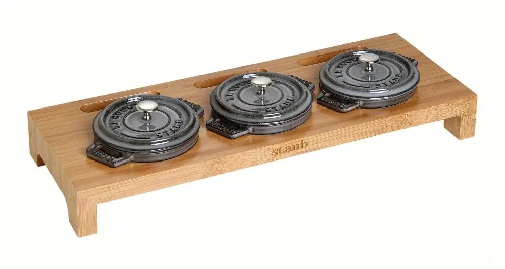 Servierbrett für 3 Mini Cocottes aus Bambus Holz (ohne Cocotten). Ideal zum Servieren von 3