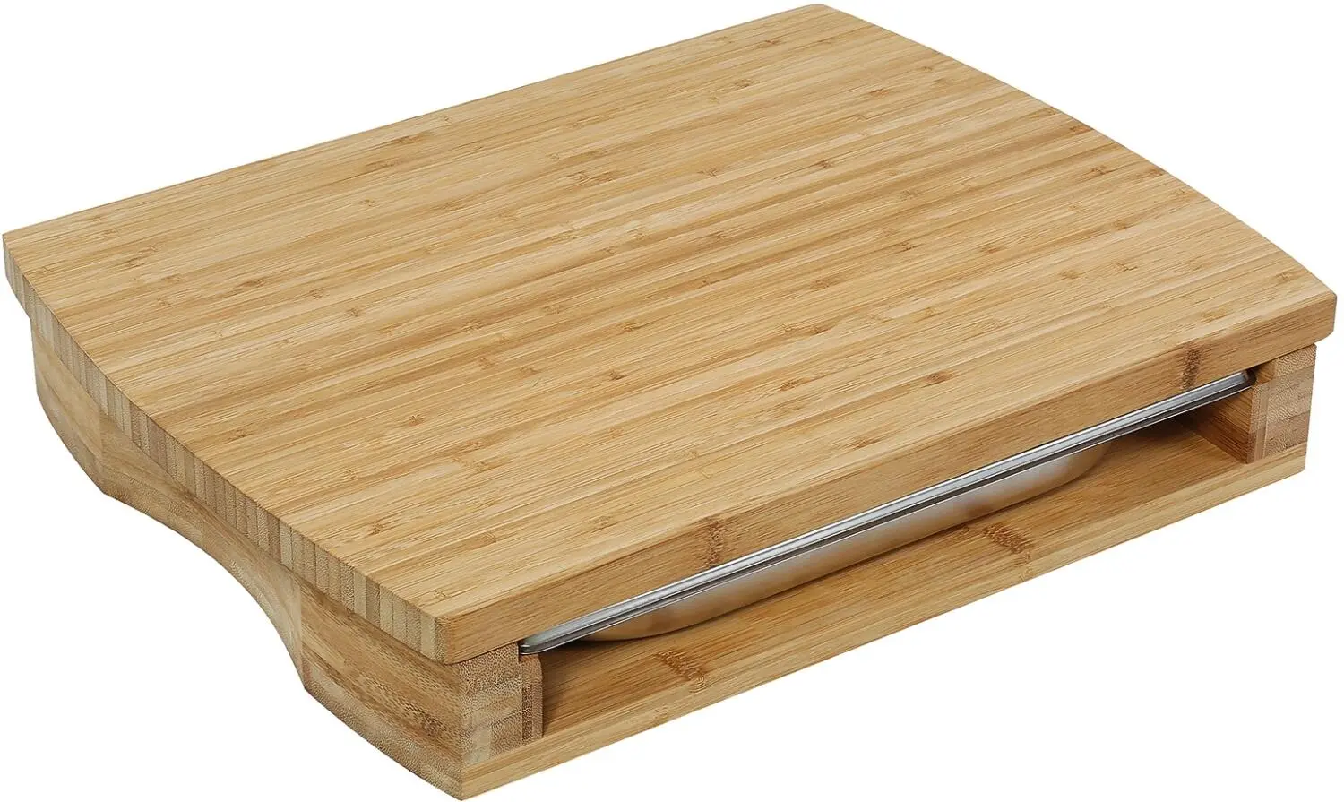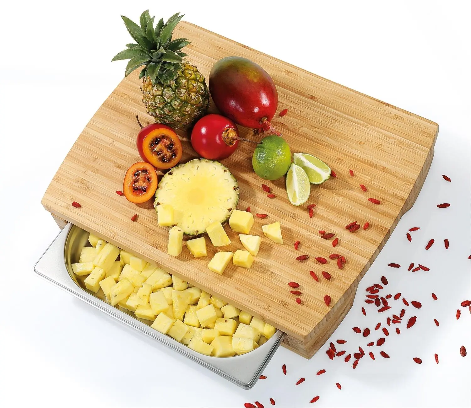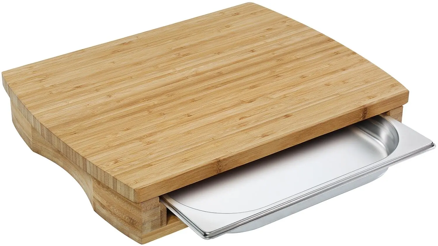 Meal Prep leicht gemacht! Das Arbeitsbrett eignet sich dank der integrierten Edelstahl-Auffangschale ideal zum Vor- und Zubereiten von Speisen. Sie können Zutaten und Abfall sauber separieren. Praktisch: Das Schneidbrett ist auch separat einsetzbar. Außerdem erlauben Griffmulden den Einsatz von Tellern und Schüsseln.