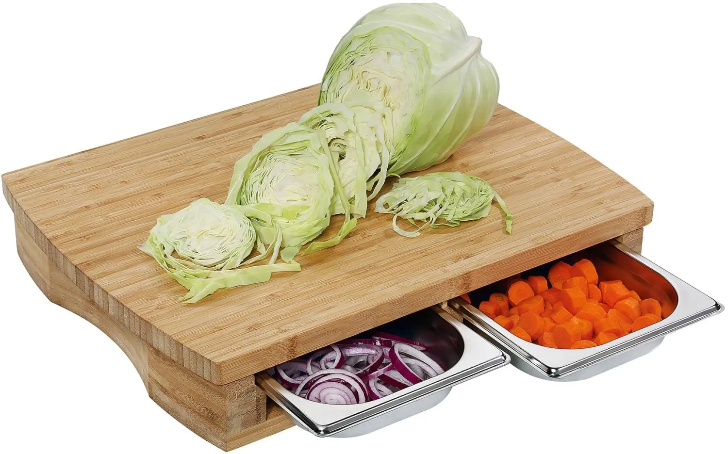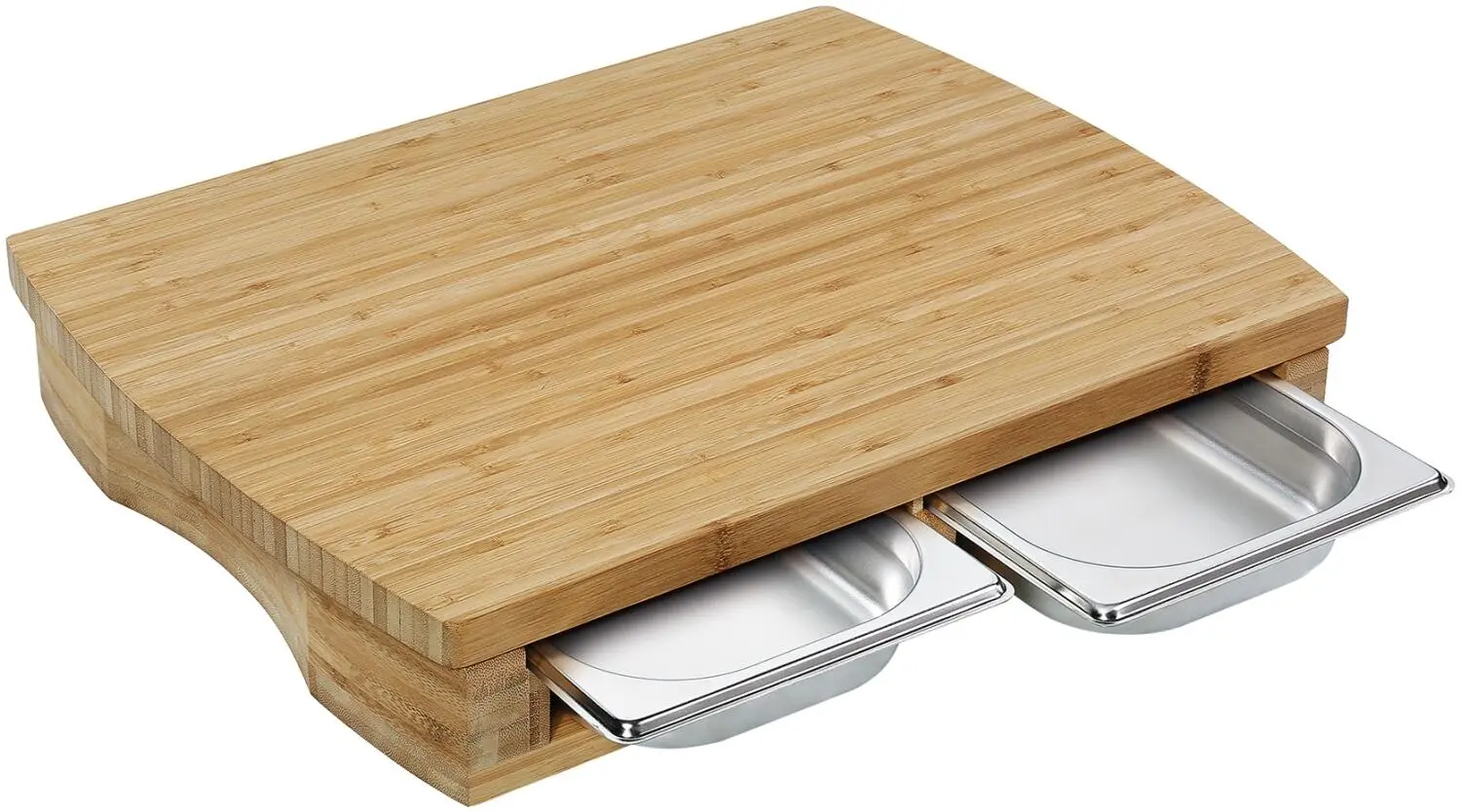 Meal Prep leicht gemacht! Das Arbeitsbrett eignet sich dank der integrierten Edelstahl-Auffangschalen ideal zum Vor- und Zubereiten von Speisen. Sie können Zutaten und Abfall sauber separieren. Praktisch: Das Schneidbrett ist auch separat einsetzbar. Außerdem erlauben Griffmulden den Einsatz von Tellern und Schüsseln.